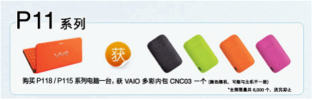 即日起至8月22日,凡购买P11全系列机型即可获赠原价为149的原装VAIO多彩内包CNC03一个,细腻的手感、绚丽的色彩以及剪裁精细的小外包,配合你的炫彩小P,魅力酷感无与伦比,走在缤纷的夏日中,你将成为绝对的抓眼球者,快给你的小P穿上VAIO彩色定制成衣,在时尚大街中刮起属于自己的时尚旋风吧!