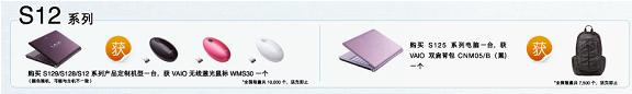 即日起至8月22日,凡购买S129/S128/S12定制机型即可获得VAIO无线激光鼠标WMS30一个,畅击智享无限!购买S125即可获得VAIO双肩背包CNM05/黑色一个,时尚大方,是您移动办公的贴身助手!特别值得您注意的是,此次赠送的黑色双肩笔记本电脑包为索尼正品,绝非任何贴牌产品,因此,当您尽享索尼S系列产品的高端平衡性能以及完美品质表现的同时,用户们还可以同时享受到来自于索尼配件背包的精细做工、美观实用、功能性超强以及不凡的整体拥有感,让您在购买索尼VAIO S系列笔记本的整个过程中享受到非凡的专业级品质!