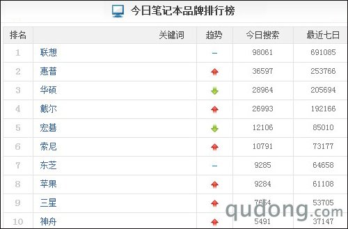 以上百度日搜索指数排行榜,品牌排行榜联想成为榜首,而且搜索量高居在上,一直持续在榜首,紧随其后的是惠普、华硕、戴尔、宏基、索尼、东芝、苹果、三星、神舟。