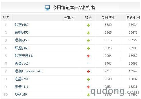根据百度笔记本产品日搜索指数显示,前10名笔记本热门产品,联想占去前六席,并且前五名全由联想笔记本产品占有,分别是Y460,Y450,联想G450,联想G460,联想天逸F41,联想笔记本产品成为笔记本市场主导品牌。彪悍Y460更是持续热销,