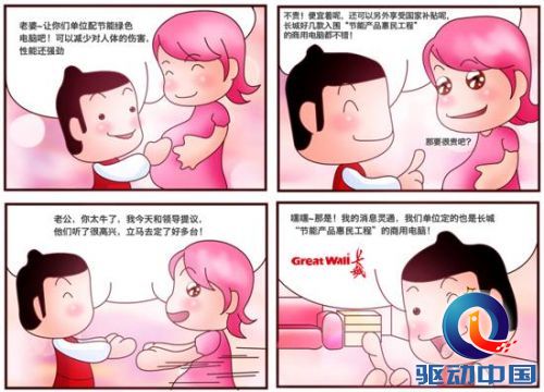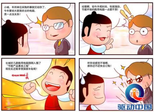 通过几组轻松幽默的四格漫画,向您展示着长城电脑的诸多优势,各种产品具有针对性的将您在不同使用场合中的问题全面解决。同时,这些产品在节能环保方面的突出表现,除了适用于个人消费者使用,也能够完全融入于企业中发挥其强大的节能作用。