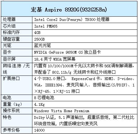 【驱动中国 行情】笔记本频道6月16日 在高清娱乐机型中,宏碁Aspire 8920G显得格外引人注目,不仅配置了蓝光Combo光驱,而且先进的45纳米Intel Core2 Duo(Penryn) T9300处理器,加上NVIDIA GeForce 9500M GS独立显卡,也使得这款笔记本的性能表现出色。采用了18英寸的亮丽宽屏,让你轻松享受蓝光高清电影所带来的震撼,并且目前的报价仅14000元,预算充足的家庭用户可以了解下这款笔记本的详细情况。