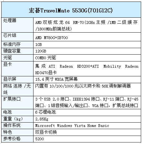 配置上:配备了AMD双核炫龙64 RM-70(2GHz主频/1MB二级缓存/1800MHz前端总线)、1GB DDR2内存、集成ATI Radeon HD3200+ATI Mobility Radeon HD3470显卡、120GB硬盘和COMBO光驱。