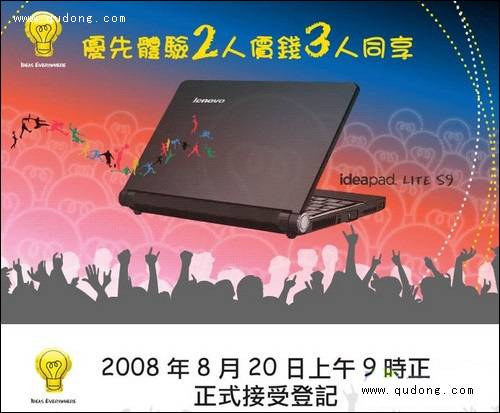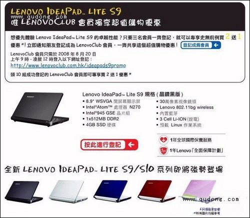 此次推出的IdeaPad S9(香港网站上名称为IdeaPad Lite S9)采用了8.9英寸WSVGA液晶屏,配置英特尔Atom N270处理器,配置Intel 945GSE芯片组,内存配置512MB,带有4GB SSD硬盘,配置30万像素摄像头,采用3芯锂离子电池。