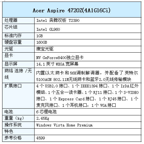 配置上:宏碁Acer Aspire 4720ZG(4A1G16Ci)标配了英特尔奔腾双核T2390处理器、英特尔GL960芯片组、802.11b/g无线局域网模块、NV GeForce8400独立显卡。1GB DDRII内存、160GB硬盘、康宝光驱,并预装了Windows vista Home Basic系统。