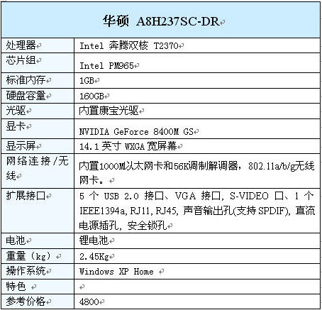 华硕此款A8笔记本采用英特尔酷睿双核T2370处理器,802.11b/g无线局域网模块,拥有1GB内存、160GB硬盘、内置COMBO光驱,预装WINXP HOME操作系统。