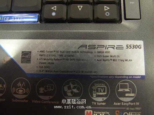 硬件配置上,5530G采用的是AMD的Griffin处理器,AMD Turion 64 X2 RM-70(2.0GHz,DDR2-800,1MB缓存),主板芯片组用的是AMD RS780M+SB700芯片组,这个芯片组集成ATI HD 3200显示核心,1G内存,250G硬盘,DVD双层刻录光驱,除芯片组集成显示核心,配置中还另外配置了ATI Mobility Radeon HD 3470独立显卡,可与集成显卡配合实现混合交火技术,效果比单独使用HD3470显卡要提升很多。系统预装了Windows Vista Home Basic,并附带其它应用软件PUMA平台同样也对无线网络作出了要求,因此,5530G配置了802.11b/g无线网卡,同时集成百兆以太网卡以及56K Modem。标配6芯锂电池,续航效能上与迅驰不相上下。提供三年主要部件保修。