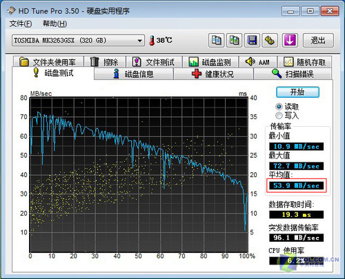 硬盘方面通过HD Tune的检测,我们能看到明基T131P使用的是一块东芝生产的320GB 5400RPM SATA硬盘。经过完整的测试后,不难看出这块硬盘的平均读取速率为53.9MB/s,突发传送速率为96.1MB/s,硬盘的温度为38℃。虽然在测试曲线图中一直处于小幅度的起伏状态中,不过整体的读取速度还是很稳定的。