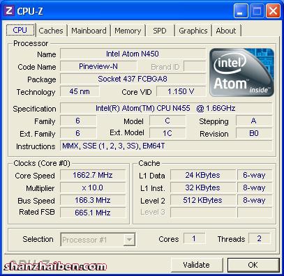 CPU-Z的硬件信息,CPU为N450,月底升级至D525双核,价格应该差距不大。