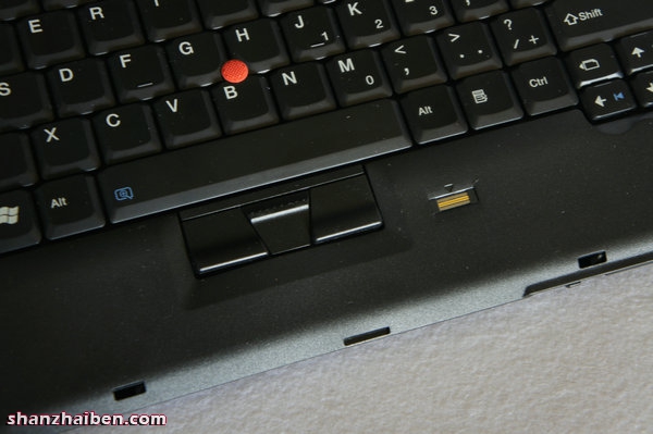 ThinkPad小红帽,轻点小红帽还有鼠标的单击、双击功能。右侧是指纹锁,这里指纹锁不是摆设,可以用的。