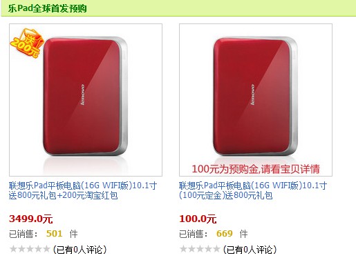 联想淘宝旗舰店上分别设有3499元全价购买乐Pad和支付100元预定乐Pad两种商品,截至我们发稿为止两件商品的销量分别为518件和673件,这意味着乐Pad一周之内仅淘宝商城的销量就超过1200台。而联想在线商城和京东旗舰店方面则没有公布预定的数量。