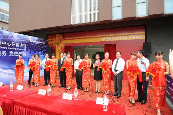 无锡市副市长方伟(左四)、联想集团新兴市场集团服务运作支持总经理吕再峰(左三)为中心开幕剪彩