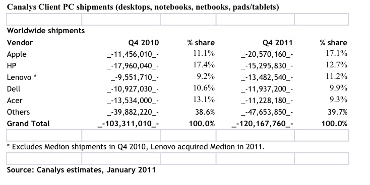 市场调研公司Canalys周一发布报告称,算上iPad平板电脑,苹果在去年四季度超越惠普成为全球最大PC厂商。Canalys将iPad等平板电脑列入了“客户PC”(client PC)统计中,此种计算方法和市场调研公司Gartner、IDC的标准PC出货计算方法有很大不同,后者只统计台式机和笔记本。