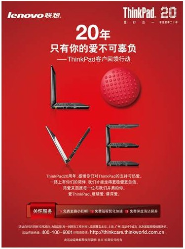 20年来,ThinkPad坚持创新,不断推出高品质的笔记本电脑,充分满足用户不同需求。同时,联想服务也不断努力,通过多元人性的服务内容及专业高效的服务品质,让人们尽享IT为生活带来的无限精彩。用户可通过国内业界覆盖最广、响应能力最强的现场服务网络,全天候、多元、便捷的网络服务,以及国际化、专业、高效的电话服务,享受到专业、安全、便捷的联想服务。联想产品服务总经理吕再峰表示:“此次ThinkPad 20周年用户关怀活动是联想服务对广大用户多年来信赖和支持的真诚回馈。未来,联想服务将一如既往地致力于通过远程网络、电话和上门三维一体服务,帮助电脑用户解决软硬件问题,为其带来专业、安全、便捷的良好体验。”