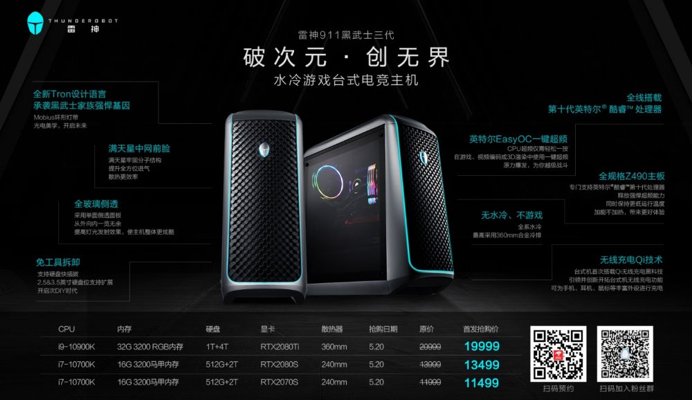 作为此次发布会重磅新品,新一代水冷游戏主机·雷神911黑武士三代,率先发布。全新Tron设计语言,承袭黑武士家族基因,贯彻光电美学,颠覆想象。Mobius环形灯带,覆盖机身,整面革新;满天星分子中网设计,类分子结构,散热增效;QI无线充电黑科技,行业首创,无线电力无线游戏;一键超频Button,物理触发,动力加速;跑车级漆面、隐藏式提手,无线升级!