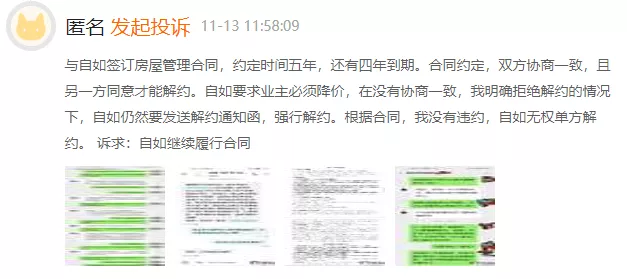 自如自身也并不“自如”,维权风波不断。《投资者网》就相关问题联系自如方面,一直未收到回复。笔者在黑猫投诉平台上输入“自如”,投诉量多达3371条,多集中在自如管家服务不到位、自如单方面解约、自如恐吓租户、隐瞒欺诈等。